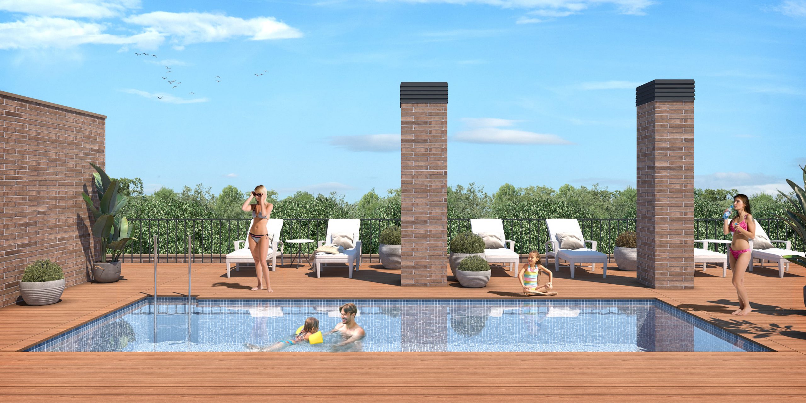 Piscina comunitaria con vaso de hormigón gunitado y revestido de gresite. Playa perimetral con pavimento natural o sintético para exteriores.