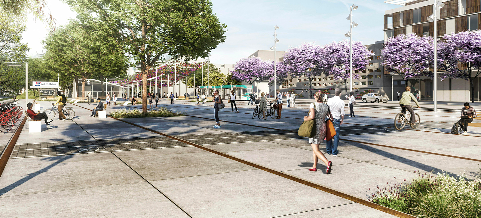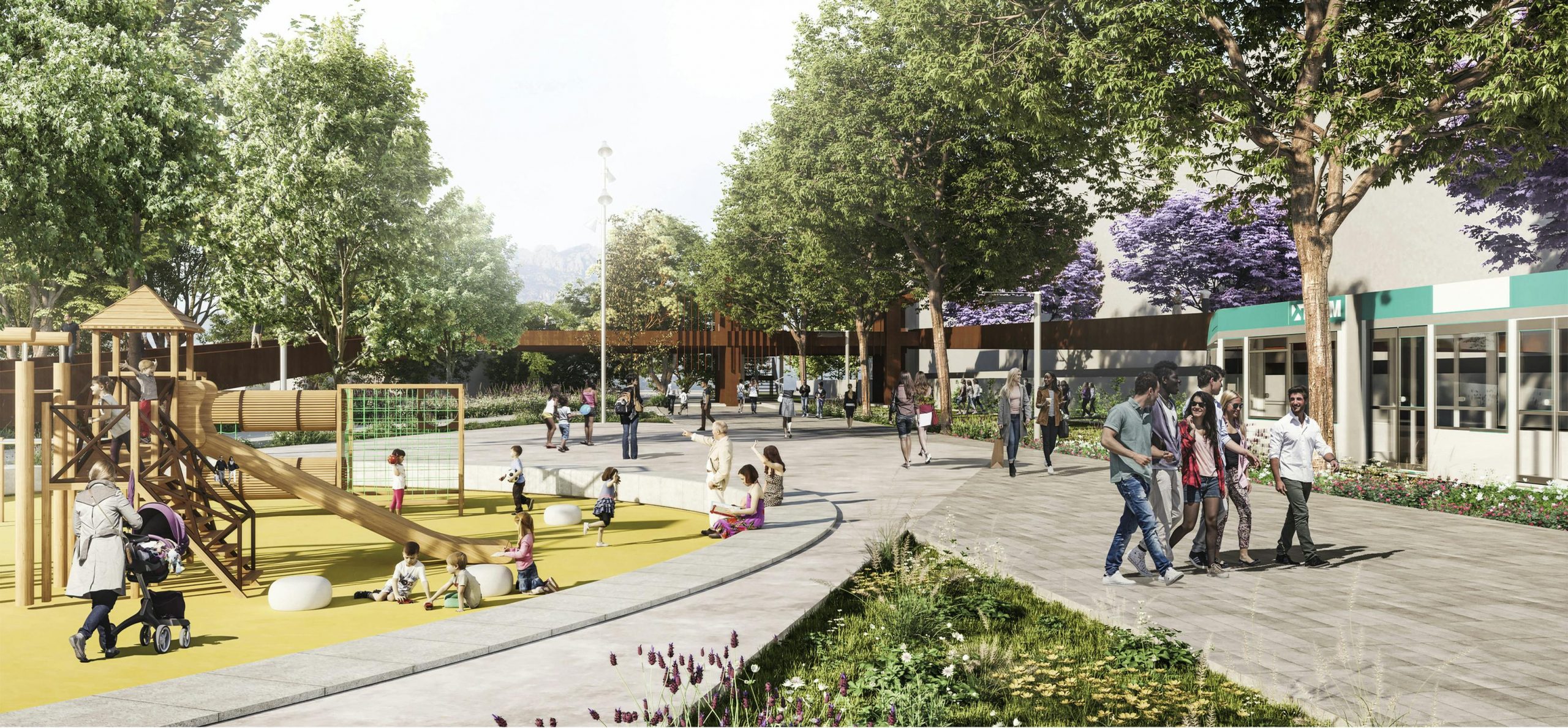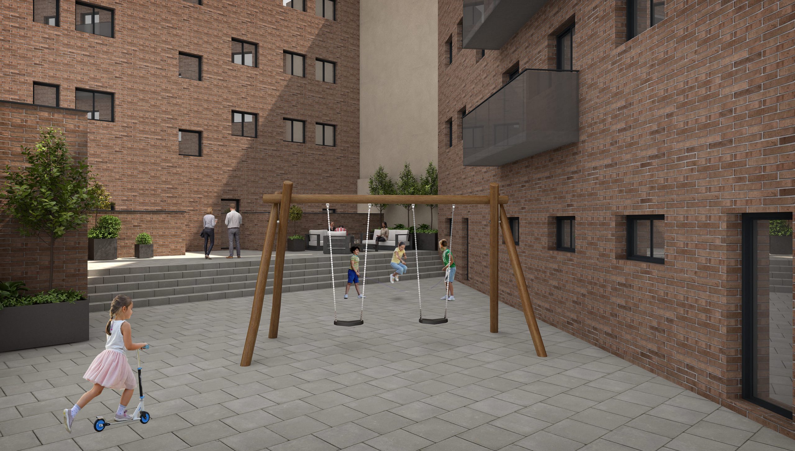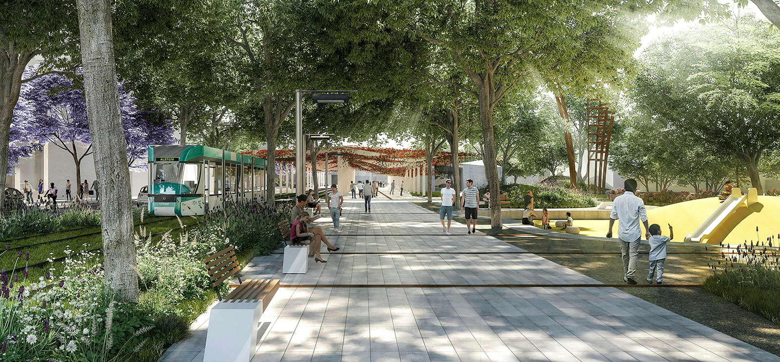 Pavimentada con gres cerámico para exteriores, iluminación LED, jardineras de superficie y bancos en PB.