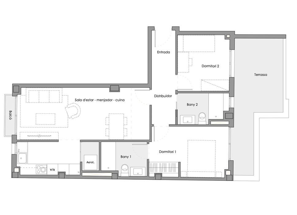 Según la distribución de cada vivienda, este espacio es un armario con puertas que alojará el hidrokit de la aerotermia y el espacio previsto para la lavadora secadora.