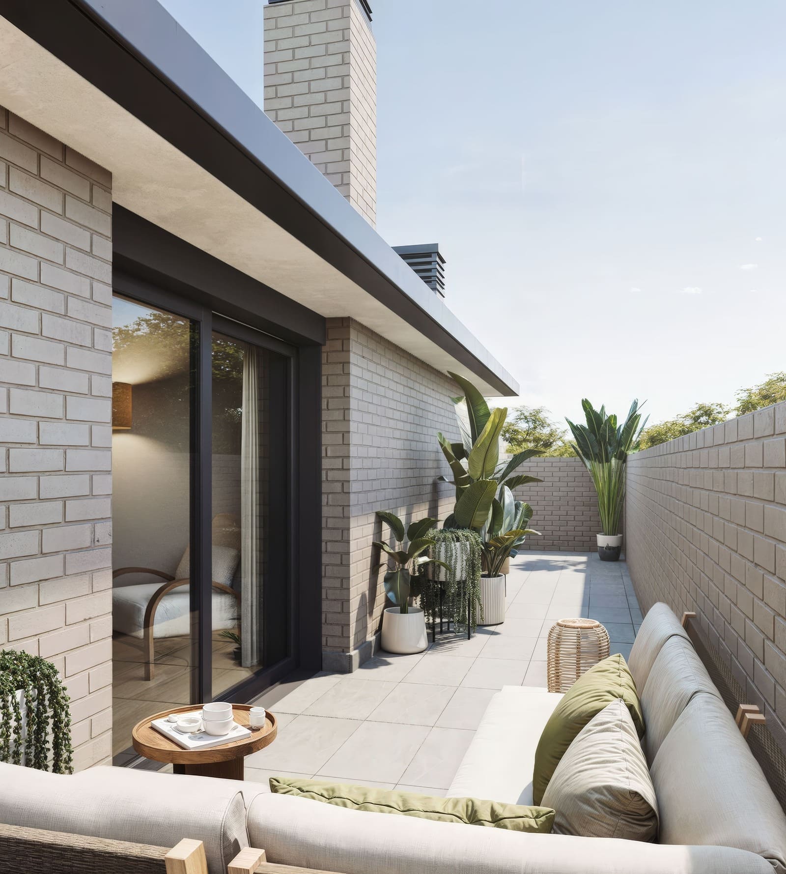 En la parte alta del edificio nos encontramos con pisos dúplex con unas espectaculares terrazas con vistas despejadas para gozar de un espacio de tranquilidad y plantas bajas con salida a terraza, ideales para crear diferentes espacios.