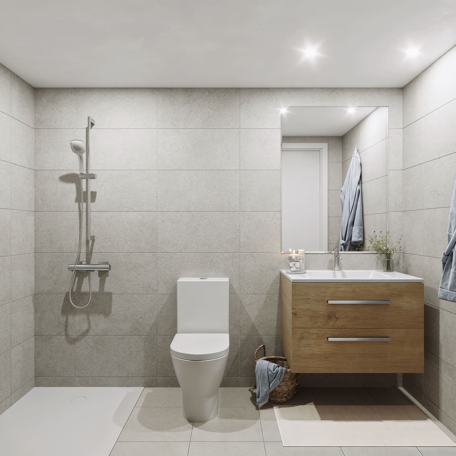 En los baños iluminación con ojos de buey de Led empotrados en el falso techo. Su distribución y número dependerá del espacio disponible fuera del registro de instalaciones.