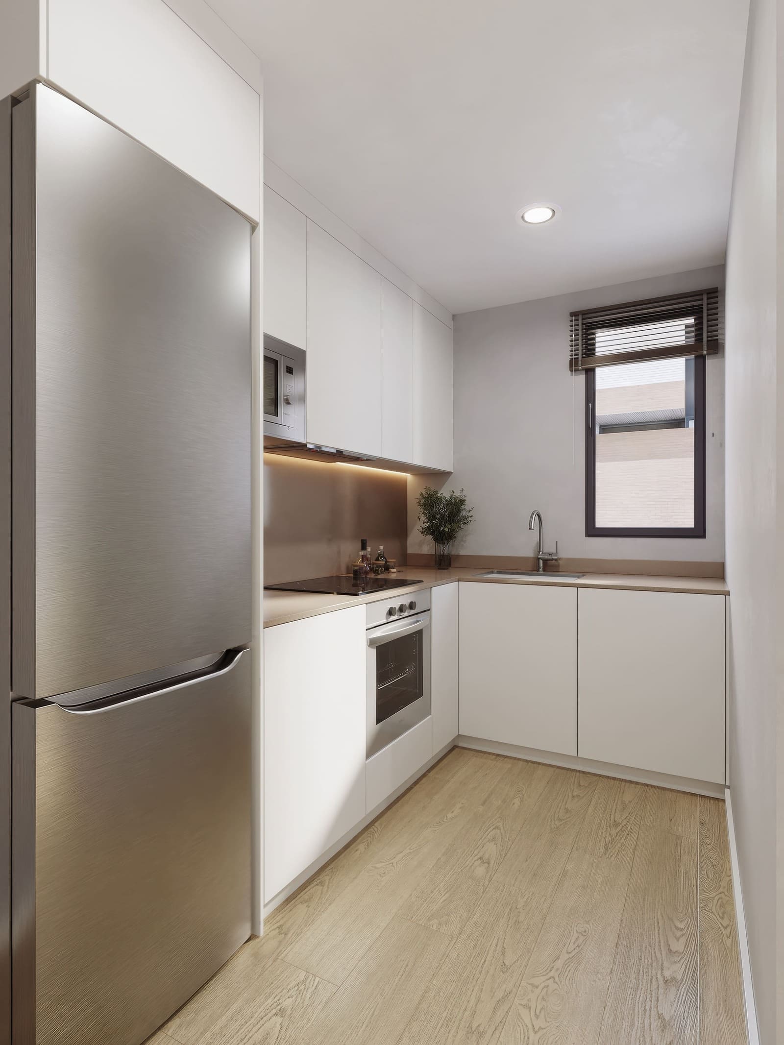 Según la distribución de cada vivienda, cocinas independientes con puerta o abiertas a la sala de estar. En las cocinas independientes el pavimento será cerámico, siendo de parqué en las cocinas abiertas a comedor.