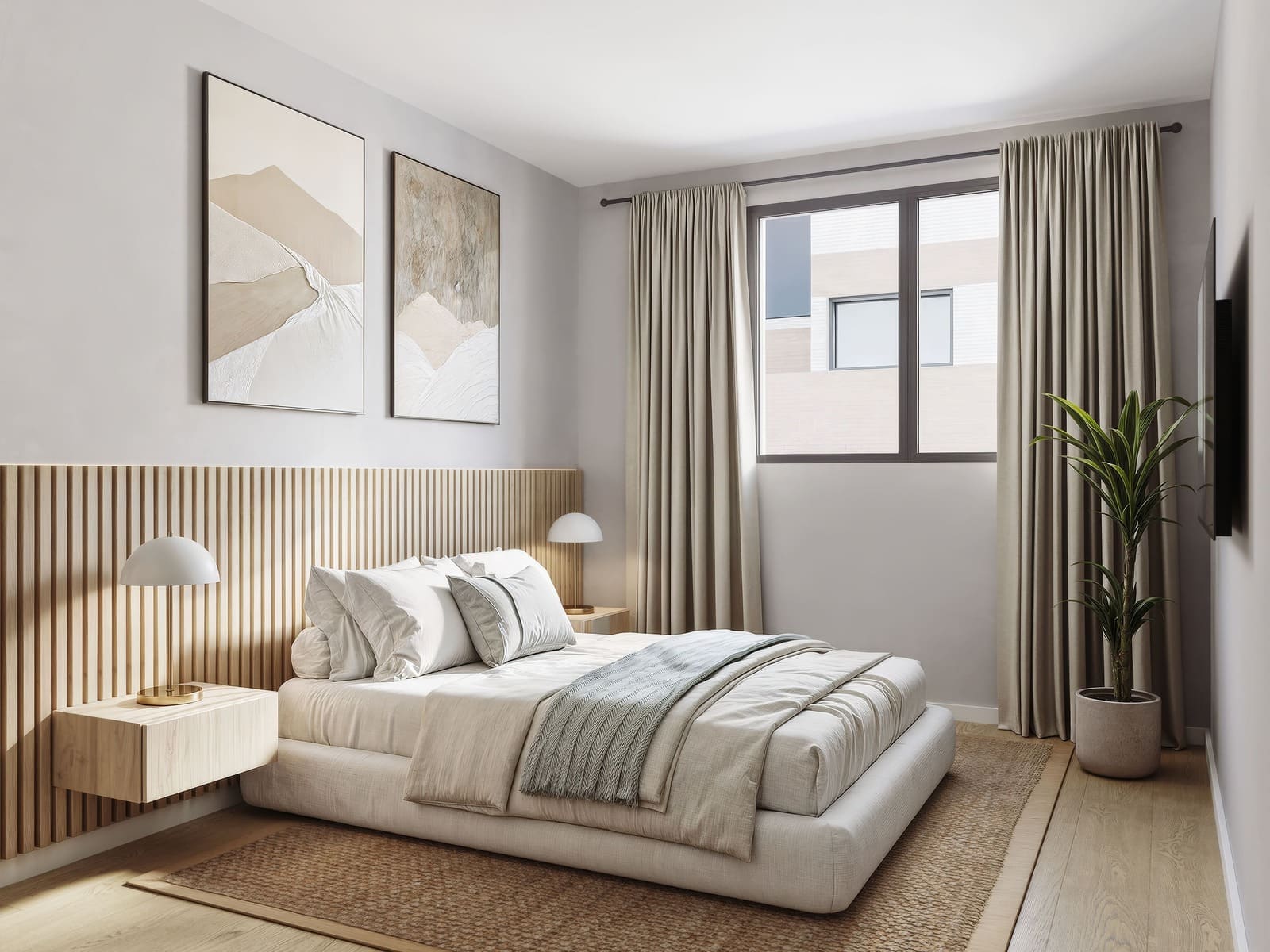 Según distribución de cada vivienda, puertas interiores batientes o correderas, de 40 mm de espesor lacadas de color blanco. Tapetas perimetrales con corte americano y aireador oculto para garantizar una correcta ventilación.